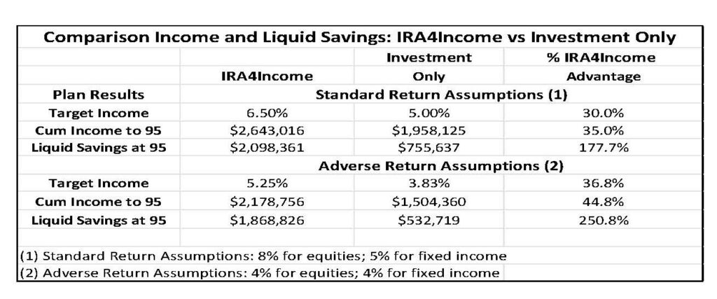 While the starting point for evaluating IRA4Income is the increase in income and liquid savings, there are individuals who can use other sources of income, e.g., interest and dividends, Social Security, pensions and other annuities, to meet additional objectives.