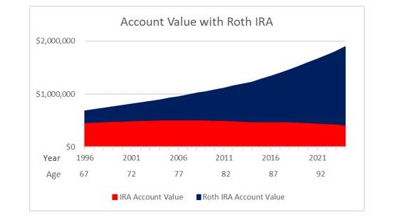 Set out below is a projection of the combined balance of the Rollover and Roth IRA, approaching $1.5 million at our investor’s passing at age 90 — or more than six times the original Roth conversion of $225,000.