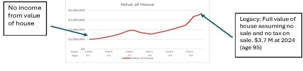 Note: Example is for male, 67, starting in 1996. Based on current annuity pricing and average historical interest rates and property growth rates. Assumes $1 million value of house and $200,000 from IRA savings to purchase QLAC.